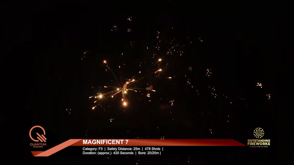 This show-stopping compound firework is not just a firework, it's a seven-act extravaganza guaranteed to leave your audience breathless. Boasting a phenomenal 478 shots fired from a combination of 20mm and 25mm tubes, the Magnificent 7 delivers a full seven minutes of awe-inspiring effects.